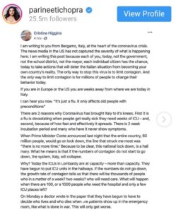 ବଲିଉଡ୍‌ ଅଭିନେତ୍ରୀ ପରିଣିତି ଚୋପ୍ରା କରୋନା ଭାଇରସ୍‌କୁ ନେଇ ଲୋକଙ୍କୁ ସଚେତନ କରାଇଛନ୍ତି। ବୁଧବାର ସେ ନିଜ ଇନ୍‌ଷ୍ଟାଗ୍ରାମ ଆକାଉଣ୍ଟରେ ଇଟାଲିରେ ରହୁଥିବା କ୍ରିଷ୍ଟିନ୍‌ ହିଗିଙ୍ଗ୍‌ସଙ୍କ ପୋଷ୍ଟକୁ ଶେୟାର କରିଛନ୍ତି। କ୍ରିଷ୍ଟିନ୍‌ ନିଜ ପୋଷ୍ଟରେ କହିଛନ୍ତି, ‘କରୋନା ଭାଇରାସ୍‌ ଯୋଗୁ ତାଙ୍କ ଦେଶ ଇଟାଲିରେ ଏବେ ପରିସ୍ଥିତି ଗମ୍ଭୀର ରହିଛି। ହସ୍ପିଟାଲଗୁଡ଼ିକ ଭର୍ତ୍ତି ହୋଇଯାଇଛି’। ଏଥିପାଇଁ କ୍ରିଷ୍ଟିନ୍‌ ବାକି ଦେଶକୁ ସମୟ ପୂର୍ବରୁ ଉଚିତ ପଦକ୍ଷେପ ଗ୍ରହଣ କରିବାକୁ ପରାମର୍ଶ ଦେଇଛନ୍ତି।