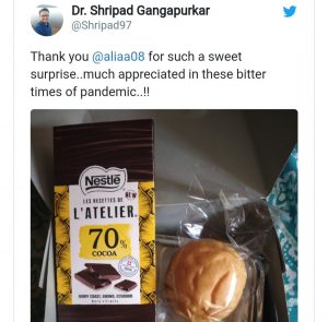 ଆଲିଆ ମୁମ୍ବାଇର କେଇଏମ ହସପିଟାଲରେ କାମ କରୁଥିବା ଡାକ୍ତର ଶ୍ରୀପଦ ଗଙ୍ଗାପୁରକର ଏକ ଟୁଇଟ କରି ଆଲିଆଙ୍କୁ ଧନ୍ୟବାଦ ଦେଇଛନ୍ତି। ଏହାସହ ଆଲଆ ପଠାଇଥିବା ସରପ୍ରାଇଜ ଗିଫ୍ଟକୁ ଏକ ଫଟୋ ମଧ୍ୟ ସେ ସେୟାର କରିଛନ୍ତି। ଏହି ଗିଫ୍ଟରେ ଚକୋଲେଟ ବାର, ସୁଇଟ ବନ, ଡ୍ରିଙ୍କ ସହ କିଛି ସ୍ନାକ୍ସ ରହିଛି। ଏହା ସହିତ ବାକ୍ସରେ ଏକ କାଗଜରେ ଆଲିଆ ଲେଖିଛନ୍ତି, ‘ଧନ୍ୟବାଦ ଆପଣମାନେ ଯାହା ବି କରୁଛନ୍ତି। ଲୋକଙ୍କୁ ସୁରକ୍ଷିତ ଏବଂ ସୁସ୍ଥ ରଖୁଛନ୍ତି। ଆପଣ ଏ ଦେଶର ଅସଲ ହିରୋ। ଏତିପାଇଁ ଡାକତର ଆଲିଆକୁ ଧନ୍ୟବାଦ ଦେଇଛନ୍ତି।