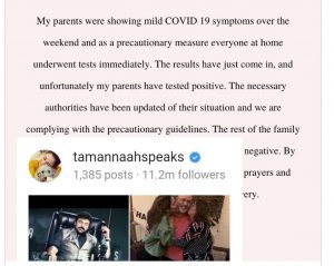 ତମନ୍ନା ଲେଖିଛନ୍ତି- “ମୋର ପିତାମାତାଙ୍କ ଠାରେ ସପ୍ତାହ ଶେଷରେ ସାମାନ୍ୟ କୋଭିଡ ଲକ୍ଷଣ ଦେଖାଯାଇଥିଲା । ସତର୍କତା ଭାବରେ ଘରର ସମସ୍ତ ଲୋକ ତୁରନ୍ତ ଯାଞ୍ଚ କରିଥିଲେ। ବର୍ତ୍ତମାନ ରିପୋର୍ଟ ଆସିଛି। ଦୁର୍ଭାଗ୍ୟବଶତଃ ମୋର ପିତାମାତା କୋଭିଡ ପଜିଟିଭ ବୋଲି ଜଣାପଡ଼ିଛନ୍ତି । ତେବେ ପରିବାରର ଅବଶିଷ୍ଟ ସଦସ୍ୟ, କର୍ମଚାରୀ ଏବଂ ମୋର ରିପୋର୍ଟ ନେଗେଟିଭ ଆସିଛି । ଭଗବାନଙ୍କ କୃପାରୁ ସମସ୍ତେ ଭଲ ଅଛନ୍ତି । ଆପଣ ସମସ୍ତେ ପ୍ରାର୍ଥନା ଏବଂ ଆଶୀର୍ବାଦ କରନ୍ତୁ ।’