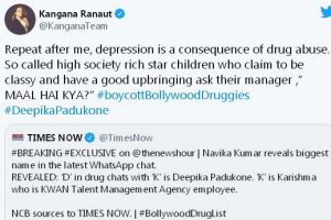 ଏହି ମାମଲାରେ କଙ୍ଗନା ରଣାୱତ ପ୍ରତିକ୍ରିୟା ରଖିଛନ୍ତି । ସେ ଟ୍ୱିଟ କରି କହିଛନ୍ତି, “ମୋ ପରେ ପୁନରାବୃତ୍ତି କର, ଡିପ୍ରେସନ ଡ୍ରଗ୍ସର ଦୁରୁପଯୋଗର ପରିଣାମ । ଯେଉଁ ହାଇ ସୋସାଇଟିରେ ଧନୀ ଘର ପିଲା ଶ୍ରେଷ୍ଠ ବୋଲି ଦାବି କରାଯାଇଛି, ଯେଉଁମାନଙ୍କର ଭଲ ପ୍ରତିପୋଷଣ ହୋଇଥାଏ, ସେମାନେ ନିଜ ମ୍ୟାନେଜରକୁ ପଚାରିଥାନ୍ତି- ମାଲ ଅଛି କି ?” କଙ୍ଗନାଙ୍କ ଏହି ଟ୍ୱିଟ ପରେ ୟୁଜର୍ସ ମଧ୍ୟ ପ୍ରତିକ୍ରିୟା ରଖିଛନ୍ତି ।