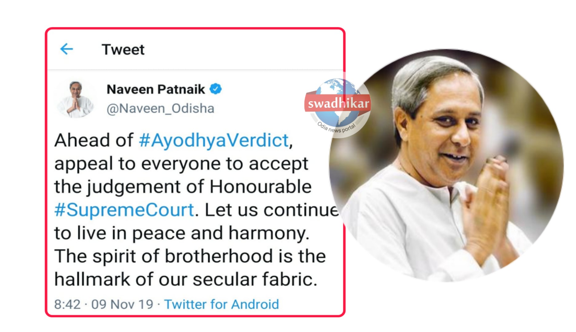 ଭୁବନେଶ୍ୱର : ଅଳ୍ପ କିଛି ସମୟ ପରେ ଅଯୋଧ୍ୟା ମାମଲାର ଶୁଣାଣି ହେବ । ଏହି ରାୟକୁ ଶୁଣିବାକୁ ସମସ୍ତେ ଅପେକ୍ଷା କରିଥିବା ବେଳେ ଆଯୋଧ୍ୟା ରାୟ ପୂର୍ବରୁ ମୁଖ୍ୟମନ୍ତ୍ରୀ ନୀବନ ପଟ୍ଟନାୟକ ଟ୍ୱିଟ କରିଛନ୍ତି ।