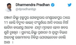 ସେହିପରି କେନ୍ଦ୍ରମନ୍ତ୍ରୀ ଧର୍ମେନ୍ଦ୍ର ପ୍ରଧାନ ଏହି ଘଟଣାରେ ଶୋକ ପ୍ରକାଶ କରିଛନ୍ତି। ସେ ଟ୍ୱିଟ ଯୋଗେ ଆହତଙ୍କ ଆଶୁଆରୋଗ୍ୟ କାମନା କରିବା ସହ ମୃତକଙ୍କ ପରିବାର ପ୍ରତି ସମବେଦନା ଜଣାଇଛନ୍ତି। ଏହି ଦୁଃଖଦ ସମୟରେ ମହାପ୍ରଭୁ ଜଗନ୍ନାଥ ମୃତକଙ୍କ ପରିବାରକୁ ଧୈର୍ଯ୍ୟ ପ୍ରଦାନ କରନ୍ତୁ ବୋଲି ସେ କହିଛନ୍ତି। ଏହାସହ କେଉଁ କାରଣରୁ ଏହି ଅଘଟଣ ଘଟିଲା ତାହାର ପୁଙ୍ଖାନୁପୁଙ୍ଖ ତଦନ୍ତ କରାଯାଉ ବୋଲି ସେ ଦାବି କରିଛନ୍ତି।