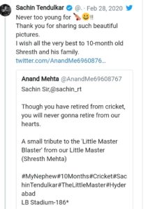 ଟ୍ଵିଟରରେ ଆନନ୍ଦ ମେହେତା ନାମକ ଜଣେ ବ୍ୟକ୍ତି ତାଙ୍କ ୧୦ ମାସର ଭଣଜାର କିଛି ଫଟୋ ସେୟାର କରି ସଚିନ୍‌ଙ୍କୁ ଟ୍ୟାଗ୍‌ କରିଥିଲେ। ଏହି ଫଟୋରେ ୧୦ ମାସର କୁନି ଶ୍ରେଷ୍ଠ ଟିମ୍‌ ଇଣ୍ଡିଆର ନୀଳ ଜର୍ସି ପିନ୍ଧିଛି, ଯାହା ପଛରେ ୧୦ ଓ ଉପରେ ତେନ୍ଦୁଲକର ଲେଖାଯାଇଛି। ଶ୍ରେଷ୍ଠ ଏହି ଫଟୋରେ ପଡ଼ିଆରେ ବସି ବ୍ୟାଟ୍‌ ଧରିଥିବା ଦେଖାଯାଇଛି। ସବୁଠାରୁ ଆଶ୍ଚର୍ଯ୍ୟ କଥା ହେଉଛି ଆନନ୍ଦଙ୍କ ଏହି ପୋଷ୍ଟ ସଚିନ ତେନ୍ଦୁଲକରଙ୍କୁ ଖୁବ ପସନ୍ଦ ଆସିଥଲା ଓ ସେ ଏହାର ରିପ୍ଲାଏ ମଧ୍ୟ ଦେଇଛନ୍ତି।