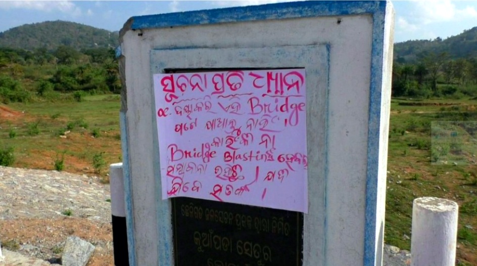 ଗଜପତି : ଗଜପତି ଜିଲ୍ଲା ଆର.ଉଦୟଗିରି ବ୍ଲକ ମହେନ୍ଦ୍ରଗଡ ନିକଟସ୍ଥ କୂଆଁପଡା ପୋଲରେ ଲଗାଯାଇଛି ଧମକ ପୂର୍ଣ୍ଣ ଚିଠି। ଏହି ଚିଠିରେ ଲେଖାଯାଇଛି  ଯେ ‘ବ୍ରିଜ୍ ଦେଇ  କେହି ଯାଆନ୍ତୁ  ନାହିଁ, କାହିଁକିନା  ଏହି ବ୍ରିଜଟିକୁ ବ୍ଲାଷ୍ଟିଂ କରାଯିବ’।