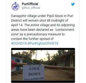 ପୁରୀ : ପୁରୀ ଜିଲ୍ଲା ପିପିଲି ଅଞ୍ଚଳ ଦାନଗହୀରରୁ ଜଣେ କରୋନା ପଜିଟିଭ ଚିହ୍ନଟ ହେବା ପରେ ଏହି ସ୍ଥାନକୁ ଆଜି ଜିଲ୍ଲା ପ୍ରଶାସନ ତରଫରୁ ସିଲ କରିଦିଆଯାଇଛି। ଏଥିସହ ଦାନଗହୀର ସମେତ ଜୟପୁର ଶାସନ ଛକ ଓ ଜୟପୁର ଛକ ଅଞ୍ଚଳକୁ ଆଜିଠାରୁ ଏପ୍ରିଲ ୧୪ ଯାଏଁ ସଟଡାଉନ ଘୋଷଣା କରାଯାଇଛି।