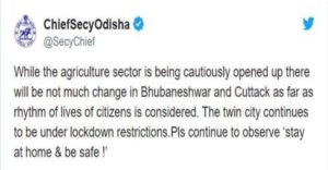 ମୁଖ୍ୟ ସଚିବ ଅସିତ କୁମାର ତ୍ରିପାଠୀ ଟୁଇଟ ଜରିଆରେ କହିଛନ୍ତି ଯେ, କୃଷିକାର୍ଯ୍ୟକୁ ଖୁବ୍ ସାବଧାନତାର ସହ ଆରମ୍ଭ କରାଯାଉଛି। କିନ୍ତୁ କଟକ ଓ ଭୁବନେଶ୍ୱରରେ ବେଶି କିଛି ବଦଳିବ ନାହିଁ । କଟକଣା ପୂର୍ବଭଳି ଜାରି ରହିବ। ସେଥି ପାଇଁ ଲୋକେ ଦୟାକରି ଘରେ ରୁହନ୍ତୁ । ଲୋକେ ନିରାପଦରେ ରୁହନ୍ତୁ ବୋଲି ମୁଖ୍ୟ ଶାସନ ସଚିବ ପରାମର୍ଶ ଦେଇଛନ୍ତି ।