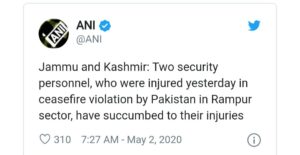 ଭାରତୀୟ ସେନା ପାକିସ୍ତାନର ଏଭଳି ଘୃଣ୍ୟ କାମକୁ ବିରୋଧ କରି କଡା଼ ଜବାବ ଦେଇଥିଲା । କିନ୍ତୁ ପାକିସ୍ତାନର ଗୁଳିରେ ୪ ଜଣ ସୈନିକ ଆହତ ହୋଇଥିଲେ । ସେମାନଙ୍କୁ ନିକଟସ୍ଥ ସେନା ହସ୍ପିଟାଲରେ ଭର୍ତ୍ତି କରାଯାଇଥିଲା । ଶୁକ୍ରବାର ବିଳମ୍ବିତ ସନ୍ଧ୍ୟାରେ ଚିକିତ୍ସାଧୀନ ଅବସ୍ଥାରେ ୨ ଜଣ ଯବାନ ଶେଷ ନିଃଶ୍ୱାସ ନେଇଛନ୍ତି । ସେମାନେ ହେଲେ ଜଣେ ହାବିଲଦାର ଗୋକର୍ଣ୍ଣ ସିଂହ ଓ ଅନ୍ୟ ଜଣେ ନାୟକ ଶଙ୍କର ଏସପି ।