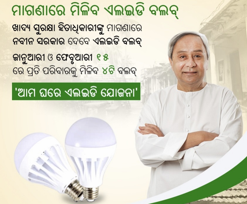 ଭୁବନେଶ୍ବର: ଖାଦ୍ୟ ସୁରକ୍ଷା ହିତାଧିକାରୀଙ୍କୁ ମାଗଣାରେ ମିଳିବ ଏଲଇଡି ଲାଇଟ । ଆମ ଘରେ ଏଲଇଡି ଯୋଜନାର ଶୁଭାରମ୍ଭ କଲେ ମୁଖ୍ୟମନ୍ତ୍ରୀ । NFSA ଓ SFSS ହିତାଧିକାରୀଙ୍କୁ ମିଳିବ ମାଗଣା ଲାଇଟ ମିଳିବ । ହିତାଧିକାରୀଙ୍କୁ ୯ ଓ୍ଵାଟର ୪ଟି ଏଲଇଡି ଲାଇଟ ଦିଆଯିବ । ୯୫ ଲକ୍ଷ ପରିବାର ଏଥିରେ ଉପକୃତ ହେବେ । ଆସନ୍ତା ଜାନୁୟାରୀ ଓ ଫେବୃଆରୀ ୧୫ରେ ଆଗାମୀ ପୀଠା କ୍ୟାମ୍ପରେ ଏହି ଲାଇଟ ବଣ୍ଟାଯିବ କରାଯିବ ।
