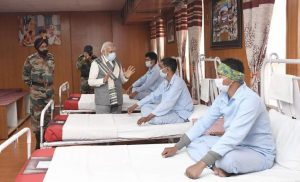 ମୋଦି ହସ୍ପିଟାଲ ମଧ୍ୟରେ ମାଇକର ଫୋନ୍ ବ୍ୟବହାର କରି ଆହତ ଯବାନଙ୍କୁ ପ୍ରଶଂସା କରିଛନ୍ତି। ଯବାନମାନେ ଆହତ ଥିଲେ ମଧ୍ୟ ମୋଦିଙ୍କ ପରିଦର୍ଶନ ବେଳେ ସେମାନେ ବେଡ୍ ଉପରେ ବସି ରହିଥିଲେ। ମୋଦି ଜଣଙ୍କ ପରେ ଜଣେ ଯବାନଙ୍କ ପାଖକୁ ଯାଇ ସମସ୍ତଙ୍କ ସ୍ୱାସ୍ଥ୍ୟାବସ୍ଥା ପଚାରି ବୁଝିଥିଲେ। ମୋଦି ହସ୍ପିଟାଲରେ ଚିକିତ୍ସିତ ଯବାନଙ୍କୁ କହିଛନ୍ତି ଯେ “ଯେଉଁ ବୀରମାନେ ଆମକୁ ଛାଡ଼ି ଚାଲି ଯାଉଛନ୍ତି, ସେମାନେ କୌଣସି କାରଣ ନଥାଇ ଆମ ପାଖରୁ ଯାଇ ନାହାନ୍ତି। ଦେଶର ସାର୍ବଭୌମତ୍ୱକୁ ରକ୍ଷା କରି ସହିଦ ହୋଇଛନ୍ତି। ଆପଣମାନେ ସମସ୍ତେ ଶତ୍ରୁପକ୍ଷଙ୍କୁ ଉଚିତ ଜବାବ ଦେଇଛନ୍ତି। ଆପଣଙ୍କ ବୀରତ୍ୱ ଓ ମାତୃଭ ପ୍ରତି ଦେଇଥିବା ରକ୍ତ ଆମ ଯୁବକମାନଙ୍କୁ ପ୍ରେରଣା ଯୋଗାଇବ। ପିଢ଼ି ପରେ ପିଢ଼ି ଏହାକୁ ମନେ ରଖିବେ।