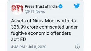 ନୂଆଦିଲ୍ଲୀ : ପଳାତକ ହୀରା ବ୍ୟବସାୟୀ ନିରବ ମୋଦୀ ଉପରେ ପ୍ରବର୍ତ୍ତନ ନିର୍ଦ୍ଦେଶାଳୟ(ED) ବଡ କାର୍ଯ୍ୟାନୁଷ୍ଠାନ ନେଇଛି। ପ୍ରବର୍ତ୍ତନ ନିର୍ଦ୍ଦେଶାଳୟ କହିଛନ୍ତି, ପଳାତକ ଆର୍ଥିକ ଅପରାଧ ଅଧିନିୟମ ଆଧାରରେ ନିରବ ମୋଦୀର ୩୨୯.୬୬ କୋଟି ଟଙ୍କାର ସଂପତ୍ତି ଜବତ କରାଯାଇଛି। ଉଲ୍ଲେଖନୀୟ, ଜୁନ୍ ପ୍ରଥମ ସପ୍ତାହରେ ପିଏମଏଲଏ କୋର୍ଟ ଆଦେଶ ଦେଇଥିଲା ଯେ, ନିରବ ମୋଦୀର ସମସ୍ତ ସଂପତ୍ତି ଜବତ କରାଯାଉ। ଏହି ଆଦେଶ ପରେ ଏବେ ନିରବ ମୋଦୀର ଜବତ ହୋଇଥିବା ସମସ୍ତ ସଂପତ୍ତି ଭାରତ ସରକାରଙ୍କ ଅଧିନକୁ ଚାଲି ଆସିଛି।