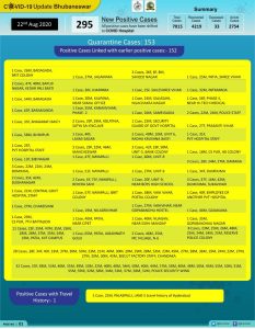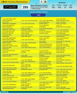 ଭୁବନେଶ୍ୱର : ଭୁବନେଶ୍ୱରରୁ ଆଉ ୨୯୫ ଜଣ କରୋନା ଆକ୍ରାନ୍ତ ଚିହ୍ନଟ। କ୍ୱାରାଣ୍ଟାଇନ୍ରୁ ୧୫୩ ଜଣ ଆକ୍ରାନ୍ତ ଥିବାବେଳେ ସ୍ଥାନୀୟ ଆକ୍ରାନ୍ତଙ୍କ ସଂଖ୍ୟା ୧୪୨। ସମୁଦାୟ ଆକ୍ରାନ୍ତଙ୍କ ସଂଖ୍ୟା ଭୁବନେଶ୍ୱରରେ ୭ହଜାର୧୧୫କୁ ବୃଦ୍ଧି ଘଟିଛି। ଚନ୍ଦକା ବିସ୍କୁଟ୍ କାରଖାନାରୁ ୨୮ କର୍ମଚାରୀ ଚିହ୍ନଟ ହୋଇଛନ୍ତି। ଏହାସହ କରୋନାରୁ ଆଉ ୧୫୮ଜଣ ଆରୋଗ୍ୟ ମଧ୍ୟ ହୋଇଛନ୍ତି ।