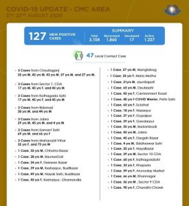 ଆଜିର ପଜିଟିଭକୁ ମିଶାଇ ସହରରେ ମୋଟ ଆକ୍ରାନ୍ତ ସଂଖ୍ୟା ୩୧୦୪କୁ ବୃଦ୍ଧି ପାଇଥିବା ବେଳେ ସେମଧ୍ୟରୁ ୧୮୬୦ ଜଣ ସୁସ୍ଥ ହୋଇଛନ୍ତି । ଯେବେକି ସହରରେ ୧୨୨୭ଟି ଆକ୍ଟିଭ କେଶ ରହିଛି । ସହରରୁ ୧୭ ଜଣଙ୍କ ଜୀବନ ନେଇ ସାରିଲାଣି ଏହି ମାରାତ୍ମକ ଭାଇରସ ।