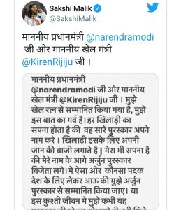 ଖେଳ ମନ୍ତ୍ରଣାଳୟର ସ୍ପଷ୍ଟୀକରଣରେ ସନ୍ତୁଷ୍ଟ ନ ହୋଇ ସାକ୍ଷୀ ମୋଦି ଏବଂ ଖେଳ ମନ୍ତ୍ରୀ କିରଣ ରିଜ୍ଜୁଙ୍କ ଏକ ଚିଠି ଲେଖିଛନ୍ତି। ଯେଉଁଥିରେ ସେ ନିଜ କ୍ୟାରିଅରରେ କେବେ ଅର୍ଜୁନ ପୁରସ୍କାର ଜିତିବେ ବୋଲି କହିଛନ୍ତି। ସାକ୍ଷୀ ଆହୁରି ମଧ୍ୟ କହିଛନ୍ତି, ‘ ମୁଁ ଖେଳରତ୍ନରେ ସମ୍ମାନିତ ହୋଇ ନିଜକୁ ଗର୍ବିତ। ପ୍ରତ୍ୟେକ ଖେଳାଳିର ସ୍ୱପ୍ନ ଥାଏ କି, ସେ ନିଜ କ୍ୟାରିଅର ମଧ୍ୟରେ ସବୁ ଆଓ୍ଵାର୍ଡ ଜିତୁ। ମୋର ମଧ୍ୟ ଏପରି ସ୍ୱପ୍ନ ରହିଛି। ମୋତେ ଅର୍ଜୁନ ପୁରସ୍କାରରେ ସମ୍ମାନିତ ହେବା ପାଇଁ ଆଉ ଦେଶ ପାଇଁ କେଉଁ ପଦକ ଜିତିବାକୁ ହେବ ବୋଲି ପ୍ରଶ୍ନ କରିଛନ୍ତି।