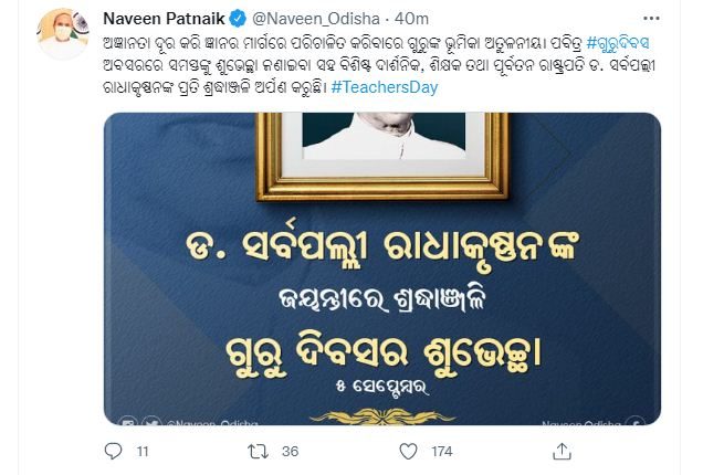 ଭୁବନେଶ୍ୱର: ଆଜି ହେଉଛି ପବିତ୍ର ଗୁରୁ ଦିବସ । ଗୁରୁଙ୍କ ଲାଗି ଦିନଟିଏ । ସର୍ବପଲ୍ଲୀ ରାଧାକୃଷ୍ଣନଙ୍କ ଜନ୍ମଜୟନ୍ତୀକୁ ଗୁରୁ ଦିବସ ରୂପେ ପାଳନ କରାଯାଏ । ପଲ୍ଲୀରୁ ଦିଲ୍ଲୀ ସବୁଠି ପାଳି ହେଉଛି ଗୁରୁ ଦିବସ । ତେବେ ଏହି ପବିତ୍ର ଦିବସ ଅବସରରେ ଶୁଭେଚ୍ଛା ଜଣାଇଛନ୍ତି ମୁଖ୍ୟମନ୍ତ୍ରୀ ନବୀନ ପଟ୍ଟନାୟକ । ସେ ନିଜର ଟ୍ୱିଟର ଆକାଉଣ୍ଟରେ ଶୁଭେଚ୍ଛା ଜଣାଇ ଲେଖିଛନ୍ତି କି, ଅଜ୍ଞାନତା ଦୂର କରି ଜ୍ଞାନର ମାର୍ଗରେ ପରିଚାଳିତ କରିବାରେ ଗୁରୁଙ୍କ ଭୂମିକା ଅତୁଳନୀୟ । ପବିତ୍ର ଗୁରୁ ଦିବସ ଅବସରରେ ସମସ୍ତଙ୍କୁ ଶୁଭେଚ୍ଛା ଜଣାଇବା ସହ ବିଶିଷ୍ଟ ଦାର୍ଶନିକ, ଶିକ୍ଷକ ତଥା ପୂର୍ବତନ ରାଷ୍ଟ୍ରପତି ଡ.ସର୍ବପଲ୍ଲୀ ରାଧାକୃଷ୍ଣନଙ୍କ ପ୍ରତି ଶ୍ରଦ୍ଧାଞ୍ଜଳି ଅର୍ପଣ କରୁଛି ।