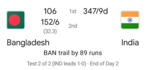 ପ୍ରଥମ ପାଳିରେ ବାଂଲାଦେଶକୁ ୧୦୬ ରନ୍ରେ ଅଲ୍ଆଉଟ୍ କରିଦେଇଥିବା ଟିମ୍ ଇଣ୍ଡିଆ ୩୪୭ ରନ୍ରେ ତାର ପ୍ରଥମ ପାଳି ଘୋଷଣା କରିଥିଲା । ଅଧିନାୟକ କୋହଲି ସର୍ବାଧିକ ୧୩୬ ରନ୍ କରିଥିଲେ ।