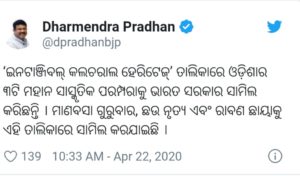 ଭାରତୀୟ ପରମ୍ପରା ଓ ସାଂସ୍କୃତିରେ ସ୍ଥାନ ପାଇଥିବା ଓଡିଶାର ତିନୋଟି ପର୍ବ ଯଥା ମାଣବସା, ଛଉନୃତ୍ୟ ଓ ପୁରୀର ରାବଣଛାୟାକୁ ନେଇ କେନ୍ଦ୍ରମନ୍ତ୍ରୀ ଧର୍ମେନ୍ଦ୍ର ପ୍ରଧାନ ପ୍ରଧାନମନ୍ତ୍ରୀ ନରେନ୍ଦ୍ର ମୋଦି ଓ କେନ୍ଦ୍ର ସଂସ୍କୃତି ମନ୍ତ୍ରୀଙ୍କୁ ଧନ୍ୟବାଦ ଜଣାଇଛନ୍ତି ।