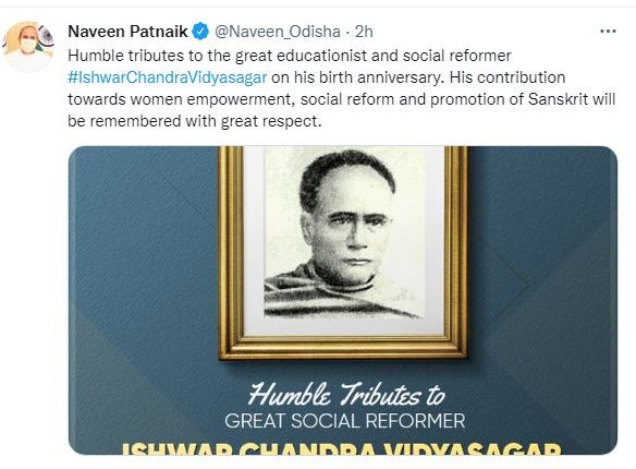 ଭୁବନେଶ୍ୱର: ମହାନ ଶିକ୍ଷାବିତ ଓ ସମାଜ ସଂସ୍କାରକ ଇଶ୍ୱର ଚନ୍ଦ୍ର ବିଦ୍ୟାସାଗରଙ୍କ ଆଜି ଜନ୍ମବାର୍ଷିକୀ । ତାଙ୍କୁ ଶ୍ରଦ୍ଧାଞ୍ଜଳି ଜଣାଇଛନ୍ତି ମୁଖ୍ୟମନ୍ତ୍ରୀ ନବୀନ ପଟ୍ଟନାୟକ । ନାରୀ ସଶକ୍ତିକରଣ, ସାମାଜିକ ସଂସ୍କାର ଓ ସଂସ୍କୃତର ପ୍ରସାର ଦିଗରେ ବିଦ୍ୟାସଗରଙ୍କ ଅବଦାନ ଚିର ସ୍ମରଣୀୟ ହୋଇ ରହିବ ବୋଲି ମୁଖ୍ୟମନ୍ତ୍ରୀ ତାଙ୍କ ବାର୍ତ୍ତାରେ କହିଛନ୍ତି ।