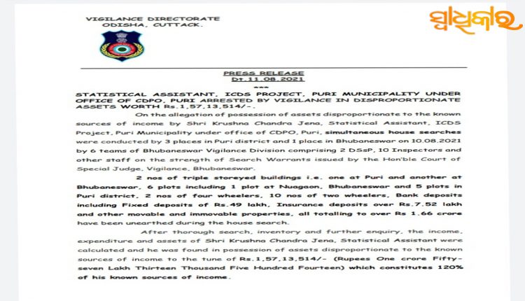 ପୁରୀ: ଆୟ ବହିର୍ଭୁତ ସମ୍ପତି ଠୁଳ ଅଭିଯୋଗରେ ପୁରୀ ପୌରପାଳିକାର ଆଇସିଡିଏସ କିରାଣୀ କୃଷ୍ଣଚନ୍ଦ୍ର ଜେନାଙ୍କୁ ଗିରଫ କରିଛି ଭିଜିଲାନ୍ସ । ୧.୭୫ କୋଟି ଟଙ୍କାର ଆୟ ବହିର୍ଭୁତ ସମ୍ପତି ଜବତ ହୋଇଛି । ଆସନ୍ତା ୨୪ ତାରିଖ ଯାଏଁ ବିଚାର ବିଭାଗୀୟ ହାଜତଙ୍କୁ ତାଙ୍କୁ ପଠାଯାଇଛି । ପୁରୀ ଜିଲ୍ଲା ଶିଶୁ ବିକାଶ ଅଧିକାରୀଙ୍କ କିରାଣି ଥିଲେ କୃଷ୍ଣଚନ୍ଦ୍ର । ଅଭିଯୋଗ ହେବା ପରେ ଏକକାଳୀନ ୩ଟି ସ୍ଥାନରେ କରାଯାଇଥିଲା ଚଢ଼ାଉ । ପୁରୀସ୍ଥିତ ଶ୍ରୀ ଗୁଣ୍ଡିଚା ବିହାର ଘର, ବ୍ରହ୍ମଗିରିସ୍ଥିତ ପୈତୃକ ବାସଭବନ ଏବଂ ଭୁବନେଶ୍ୱର ନୂଆଗାଁରେ ଥିବା ୩ ମହଲା ଘରେ ରେଡ କରାଯାଇଛି । ତିନୋଟି ଟିମ ଏକ ସମୟରେ ଚଢ଼ାଉ କରିଥିଲେ । ଛୁଆଙ୍କ ଛତୁଆ ଦୁର୍ନୀତିରେ ତାଙ୍କ ନାମ ଜଡିତ ହେବା ପରେ ଚଢ଼ାଉ କରାଯାଇଛି ।