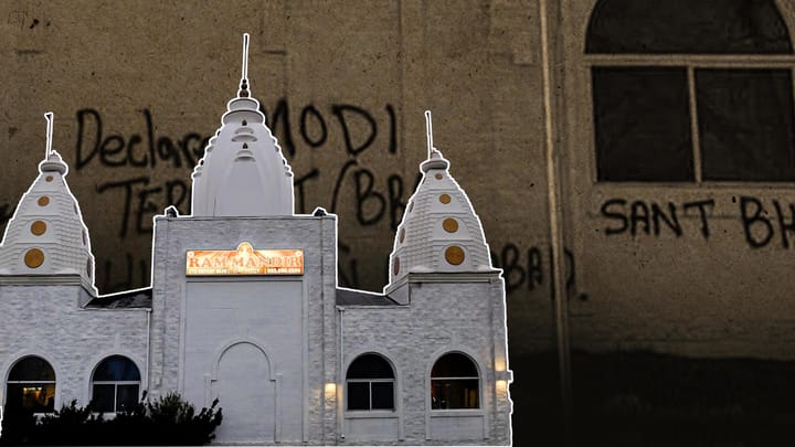 ମନ୍ଦିର କାନ୍ଥରେ ଦୁର୍ବୃତ୍ତମାନେ ‘ମୋଦୀଙ୍କୁ ଆତଙ୍କବାଦୀ ଘୋଷଣା କର (ବିବିସି)’, ‘ସନ୍ଥ ଭିନ୍ଦ୍ରାୱାଲା ସହିତ ଅଟନ୍ତି’ ଏବଂ ‘ହିନ୍ଦୁସ୍ତାନ୍ ମୁର୍ଦାବାଦ୍’ ଆଦି ‘ସ୍ଲୋଗାନ୍’ ଲେଖିଛନ୍ତି।