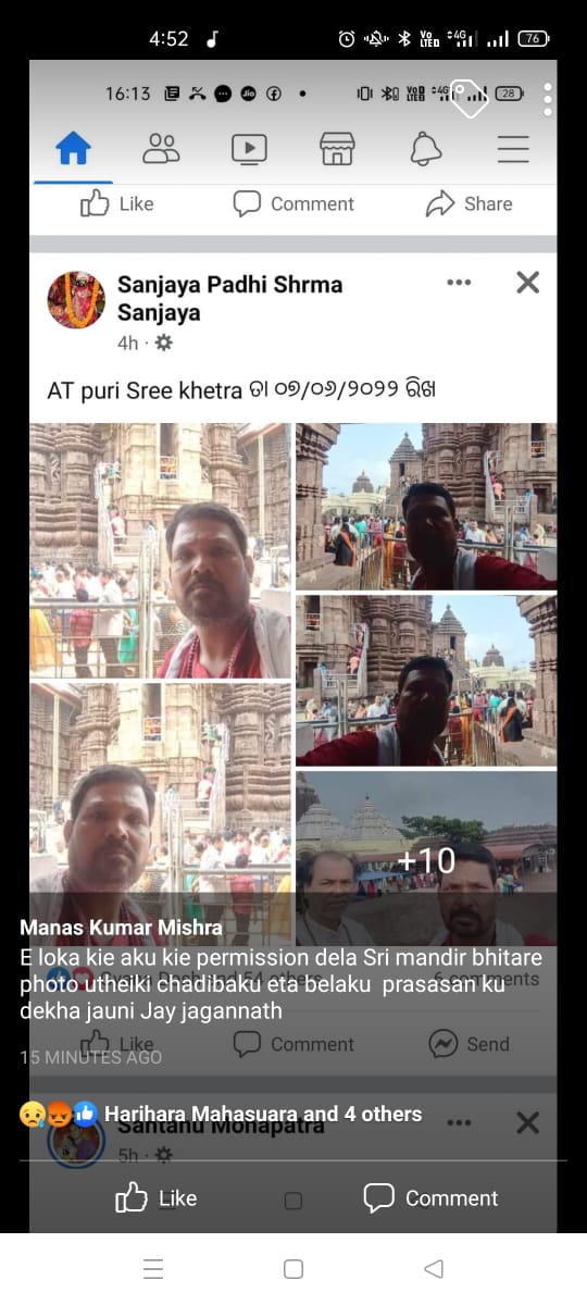ଭାଇରାଲ୍ ହେଲା ଶ୍ରୀମନ୍ଦିରର ଭିତର ବେଢାର ଫଟୋ । ସଞ୍ଜୟ ପାଢୀ ଶର୍ମା ନାମକ ଜଣେ ବ୍ୟକ୍ତି ଶ୍ରୀମନ୍ଦିର ଭିତର ଫଟୋ ନିଜ ଫେସବୁକ ଆଇଡିରେ ଅପଲୋଡ଼ କରି କରିଛନ୍ତି ଭାଇରାଲ୍। ଶ୍ରୀମନ୍ଦିର ସୁରକ୍ଷା ଉପରେ ପୁଣି ଉଠିଛି ପ୍ରଶ୍ନ।