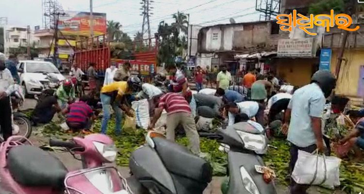 ଭୁବନେଶ୍ୱର: ବିଚ୍ ରାସ୍ତାରେ ଓଲଟି ପଡ଼ିଲା ପରିବା ବୋଝେଇ ଟ୍ରକ । ଲୋକେ ସହଯୋଗ କଣ କରିବେ ଓଲଟି ପରିବା ବୋହିନେଲେ । କିଏ ବ୍ୟାଗରେ ଲୋଡ଼ କରି ବୋହିନେଲା ତ ଆଉ କିଏ ବସ୍ତାରେ ଲୋଡ଼ କରି ବୋହିଲା । କରୋନା ଗାଇଡ଼ ଲାଇନକୁ ଲୋକେ ଏକ ପ୍ରକାର ଫୁ କରି ଦେଇଥିଲେ । କେହି ବି ମାସ୍କ ପିନ୍ଧି ନଥିଲେ କି ସାମାଜିକ ଦୂରତା କଥା ନକହିବା ଭଲ । ସେପଟେ କେହି ମଧ୍ୟ ମାନବିକତା ଦୃଷ୍ଟିରୁ ଗାଡ଼ିଟି ଉଠିବ ସେ ଚିକନ୍ତା କରି ନଥିଲେ । ତେବେ ଭୁବନେଶ୍ୱର ପଳାଶୁଣି ଓଭର ବ୍ରିଜ୍ ନିକଟରେ ଦେଖିବାକୁ ମିଳିଥିଲା ଏଭଳି ଦୃଶ୍ୟ । ପରିବା ନେବା ଲାଗି ଲୋକଙ୍କ ମଧ୍ୟରେ ଲାଗି ରହିଥିବା ପ୍ରତିଯୋଗିତାକୁ ମଧ୍ୟ ବହୁ ଲୋକ ଉପଭୋଗ କରୁଥିବା ଦେଖିବାକୁ ମିଳିଥିଲା ।