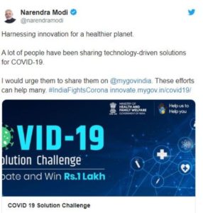 ଏହା ଭିତରେ କରୋନା ସହିତ ଲଢ଼ିବା ଲାଗି ଉପଯୁକ୍ତ ମତାମତ ଦେଲେ ଲକ୍ଷେ ୭୫ ହଜାର ଟଙ୍କାର ପୁରସ୍କାର ମିଳିବ ବୋଲି ପ୍ରଧାନମନ୍ତ୍ରୀ ନରେନ୍ଦ୍ର ମୋଦି ଟୁଇଟ୍ କରି ଜଣାଇଛନ୍ତି। ମତାମତ ଗୁଡ଼ିକ @mygovindiaରେ ପଠାଇବାକୁ ମୋଦି ସୂଚନା ଦେଇଛନ୍ତି। ଇତିମଧ୍ୟରେ ଏହାକୁ ୩୩ ହଜାରରୁ ଅଧିକ ଲାଇକ୍ ମିଳିଛି। ସୂଚନାଯୋଗ୍ୟ, ଏହାକୁ ମାର୍ଚ୍ଚ ୧୬ରେ ସନ୍ଧ୍ୟା ୭ଟା ୧୪ରେ ଶେୟାର କରାଯାଇଥିଲା।