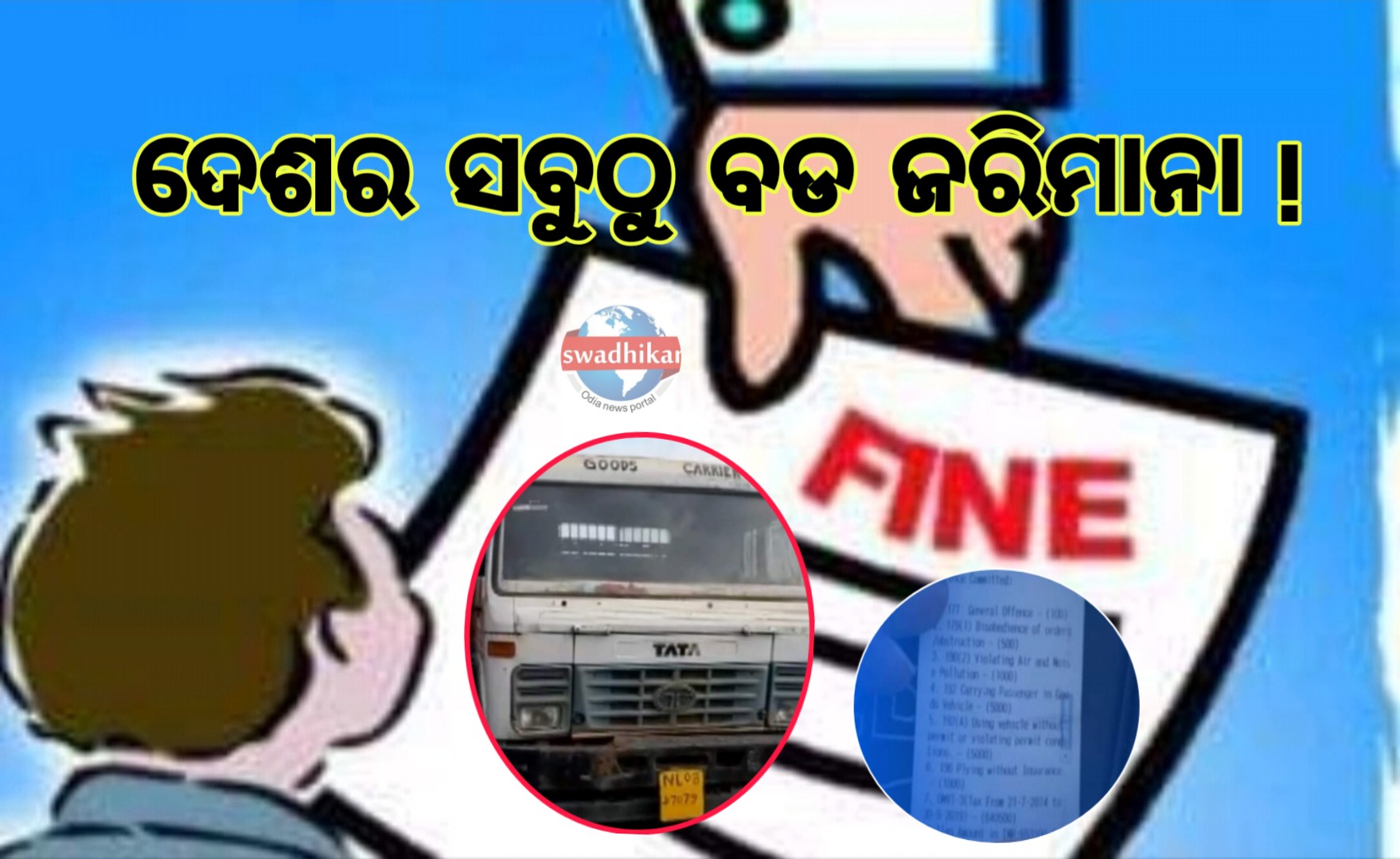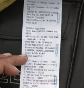 ଆଇନ ଉଲ୍ଲଂଘନ ପାଇଁ ୫୦୦ ଟଙ୍କା, ପ୍ରଦୂଷଣ ପ୍ରମାଣପତ୍ର ନଥିବାରୁ ୧୦୦୦ ଟଙ୍କା, ମାଲବାହୀ ଗାଡିରେ ଯାତ୍ରୀ ପରିବହନ କରୁଥିବାରୁ ୫ହଜାର, ପରମିଟ୍ ନଥିବାରୁ ୫ହଜାର, ବୀମା ସାର୍ଟିଫିକେଟ ନଥିବାରୁ ୧ହଜାର ଟଙ୍କା , ୨୧-୭- ୨୦୧୪ରୁ ୩୦-୯-୨୦୧୯ ପର୍ଯ୍ୟନ୍ତ ଓମଭିଟି -୩ ଟିକସ ବାବଦକୁ ୬ଲକ୍ଷ ୪୦ ହଜାର ୫୦୦ ଟଙ୍କା ଚାଲାଣ କାଟିଛି ସମ୍ବଲପୁର ଆରଟିଓ ।