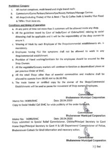 ଏହା ସହ ଏହାସହ ସମସ୍ତ ମାର୍କେଟ କମ୍ପ୍ଲେକ୍ସ, ମଲ, ଜିମ୍ନାସିୟମ, ପାର୍ଲର,ସେଲୁନ,ସ୍ପା, ମାସେଜ ସେଣ୍ଟର, ଚା ,କଫି,ପାନ,ଫାଷ୍ଟ ଫୁଡ଼ ଟିଫିନ, ଫଳ ରସ ଦୋକାନ ବନ୍ଦ ରହିବ । ବିଏମ୍ସି ପକ୍ଷରୁ ନୂଆ ମାର୍ଗ ଦର୍ଶିକା ଜାରି କରାଯାଇଛି ।