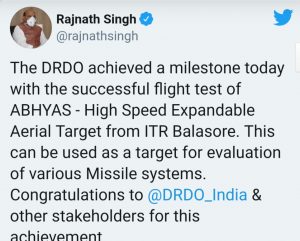 ସଫଳ ପରୀକ୍ଷଣ ପାଇଁ ଡ଼ିଆରଡ଼ିଓକୁ ଟ୍ୱିଟ ଯୋଗେ ପ୍ରତିରକ୍ଷା ମନ୍ତ୍ରୀ ରାଜନାଥ ସିଂହ ଅଭିନନ୍ଦନ ଜଣାଇଛନ୍ତି ।