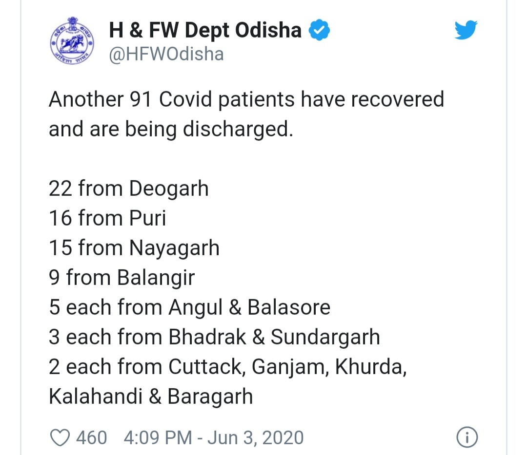 ଭୁବନେଶ୍ୱର() ରାଜ୍ୟରେ ଆଜି ୧୪୩ କରୋନା ଆକ୍ରାନ୍ତ ଚିହ୍ନଟ ହୋଇଥିବା ବେଳେ ଆଉ ୯୧ କରୋନା ଆକ୍ରାନ୍ତ ସୁସ୍ଥ ହୋଇଛନ୍ତି । ଏହାସହ ଓଡ଼ିଶାରେ କରୋନା ଆକ୍ରାନ୍ତ ସୁସ୍ଥ ସଂଖ୍ୟା ୧୪୧୬କୁ ବୃଦ୍ଧି ପାଇଛି । ସୁସ୍ଥ ହୋଇଥିବା ୯୧ ଆକ୍ରାନ୍ତଙ୍କ ମଧ୍ୟରେ ଦେବଗଡ଼ରୁ ୨୨, ପୁରୀରୁ ୧୬, ନୟାଗଡ଼ରୁ ୧୫, ବଲାଙ୍ଗୀରରୁ ୯, ଅନୁଗୁଳରୁ ୫, ବାଲେଶ୍ୱରରୁ ୫, ଭଦ୍ରକରୁ ୩, ସୁନ୍ଦରଗଡ଼ରୁ ୩, କଟକ, ଗଞ୍ଜାମ, ଖୋର୍ଦ୍ଧା, କଳାହାଣ୍ଡି ଓ ବରଗଡ଼ରୁ ୨ଜଣ ଲେଖାଏଁ ସୁସ୍ଥ ହୋଇଛନ୍ତି । ଏନେଇ ରାଜ୍ୟ ସ୍ୱାସ୍ଥ୍ୟ ଓ ପରିବାର କଲ୍ୟାଣ ବିଭାଗ ପକ୍ଷରୁ ସୂଚନା ମିଳିଛି ।