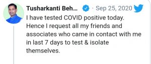 ଭୁବନେଶ୍ୱର() ରାଜ୍ୟରେ ହୋଇ କରୋନା ତାର କାୟା ବିସ୍ତାର କରିବାରେ ଲାଗିଛି । ମନ୍ତ୍ରୀଠାରୁ ଆରମ୍ଭ କରି ବିଧାୟକ ପର୍ଯ୍ୟନ୍ତ ସମସ୍ତେ ଏହାର ଶିକାର ହେବାରେ ଲାଗିଛନ୍ତି । ଏହାରି ମଧ୍ୟରେ କ୍ରୀଡା ଓ ଯୁବ ବ୍ୟାପାର ମନ୍ତ୍ରୀ ତୁଷାରକାନ୍ତି ବେହେରା କରୋନାରେ ସଂକ୍ରମିତ ହୋଇଛନ୍ତି ।