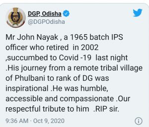 ତେବେ କରୋନା ସଂକ୍ରମଣରେ ଥିବା ଜନ୍ ନାୟକ ୧୯୬୫ ବ୍ୟାଚର ଆଇପିଏସ୍ ଅଧିକାରୀ ଥିଲେ । ସ୍ୱର୍ଗତ ନାୟକଙ୍କ ଅମର ଆତ୍ମାର ସଦଗତି କାମନା କରିଛନ୍ତି ଡିଜିପି ଅଭୟ ।