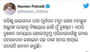 ତାଙ୍କ ବିୟୋଗରେ ଶୋକ ପ୍ରକାଶ କରିଛନ୍ତି ମୁଖ୍ୟମନ୍ତ୍ରୀ ନବୀନ ପଟ୍ଟନାୟକ ।ଏଥିସହ ସେ ଶୋକସନ୍ତପ୍ତ ପରିବାରବର୍ଗଙ୍କୁ ସମବେଦନା ଜଣାଇବା ସହ ତାଙ୍କ ଅମର ଆତ୍ମାର ସଦ୍ଗତି କାମନା କରିଛନ୍ତି ।