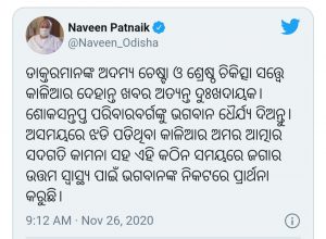 ଶୋକସନ୍ତପ୍ତ ପରିବାରବର୍ଗଙ୍କୁ ଭଗବାନ ଧୈର୍ଯ୍ୟ ଦିଅନ୍ତୁ ।’ ଅସମୟରେ ଝଡି ପଡିଥିବା କାଳିଆର ଅମର ଆତ୍ମାର ସଦଗତି କାମନା କରିବା ସହ ଜଗାର ଉତ୍ତମ ସ୍ୱାସ୍ଥ୍ୟ ପାଇଁ ଭଗବାନଙ୍କ ନିକଟରେ ପ୍ରାର୍ଥନା କରିଛନ୍ତି ମୁଖ୍ୟମନ୍ତ୍ରୀ ନବୀନ ପଟ୍ଟନାୟକ ।