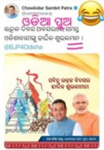 ପୁରୀରୁ ଲୋକସଭା ପ୍ରାର୍ଥୀ ହୋଇଥିବା ବିଜେପି ନେତା ସମ୍ବିତ ପାତ୍ର ଉତ୍କଳ ଦିବସ ଅବସରରେ ସୋସିଆଲ ମିଡିଆରେ ଉତ୍କଳ ଦିବସର ଶୁଭେଚ୍ଛା ଜଣାଛନ୍ତି । ହେଲେ ଓଡିଆରେ ପଣ୍ଡିତ ଏହି ନେତାଙ୍କ ଓଡିଆ ଜ୍ଞାନ ଟିକେ ଦେଖନ୍ତୁ । ଶୁଭକାମନାକୁ ଶୁଭକମାନା ବୋଲି ଲେଖିଛନ୍ତି । ଶୁଭକାମନା ଓ ଶୁଭକମାନା ମଧ୍ୟରେ ଫରକ ଜାଣିପାରୁନଥିବା ନେତା କୁଆଡେ ପୁରୀ ଭଳି ଏକ ଧର୍ମୀୟ ନିର୍ବାଚନମଣ୍ଡଳୀରୁ ପ୍ରାର୍ଥୀ ହୋଇଛନ୍ତି ବୋଲି ବିଜେଡି କଟାକ୍ଷ କରିଛି ।